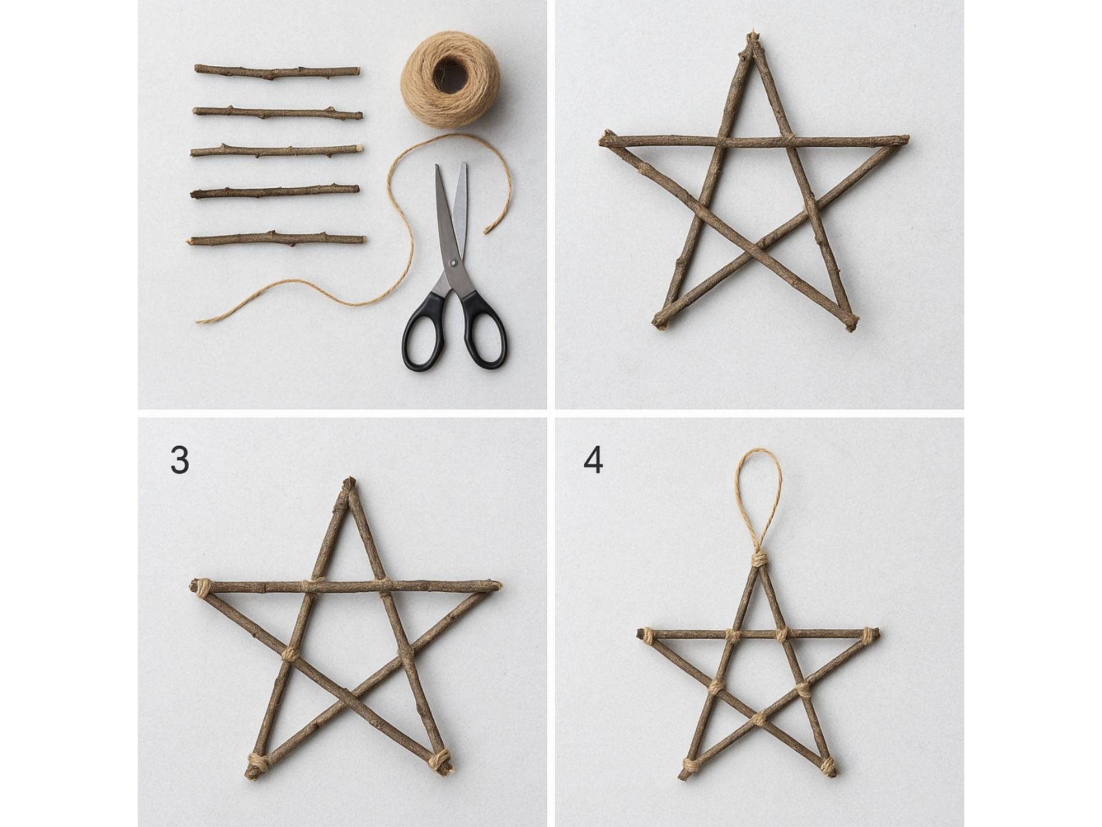 Recoge ramitas secas del jardín o del parque y córtalas todas del mismo largo. Une cinco ramitas formando una estrella y átalas con cuerda o hilo rústico. Para darle un toque más navideño, puedes añadir una rodaja de naranja seca o una ramita de canela en el centro. Cuélgalas del árbol, en la pared o en una guirnalda.