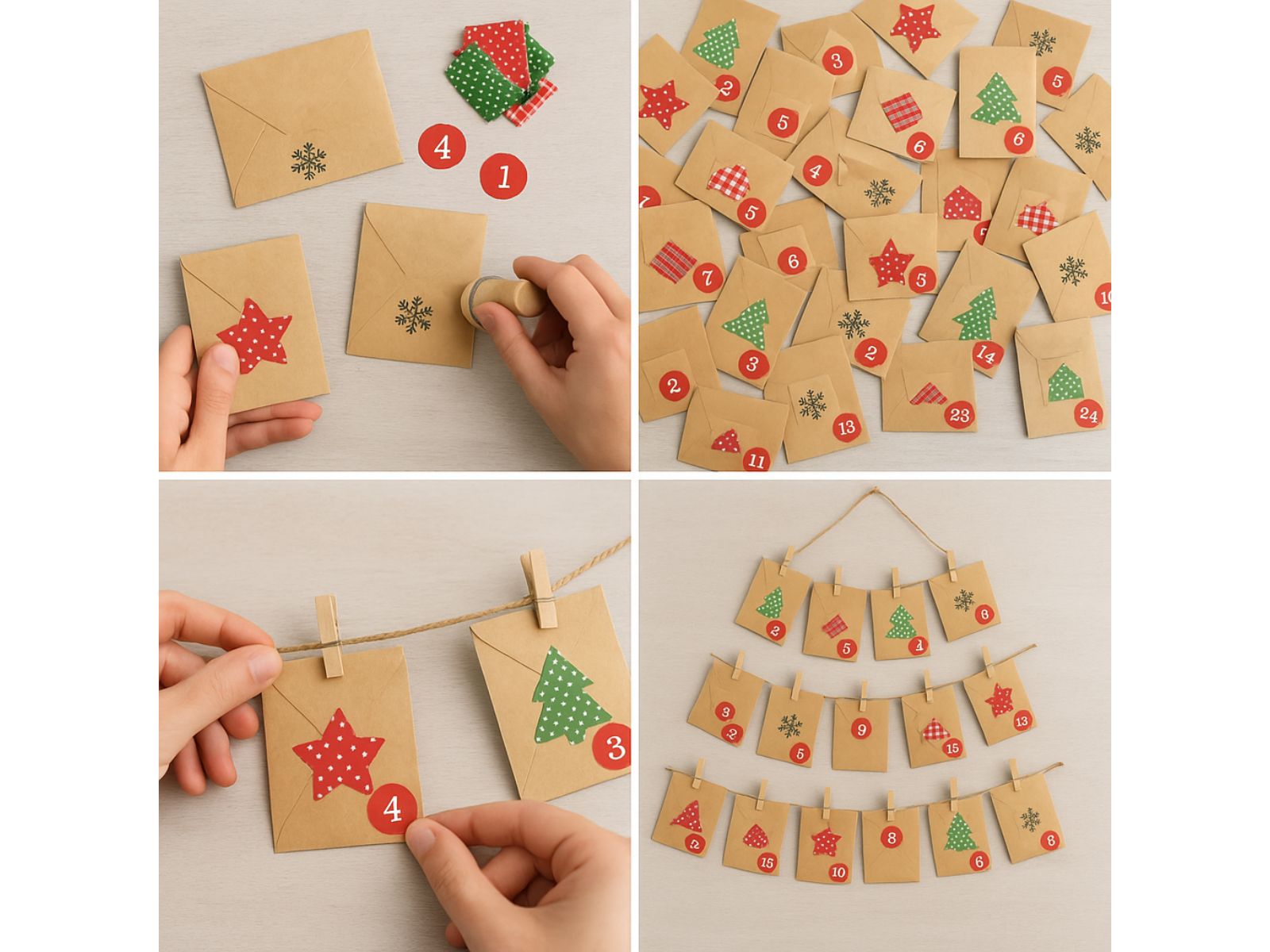 Utiliza sobres que tengas por casa y decóralos con sellos, pegatinas o retales. Colócalos con pinzas en una cuerda formando una línea o árbol. Dentro puedes poner mensajes, retos navideños o pequeñas sorpresas.