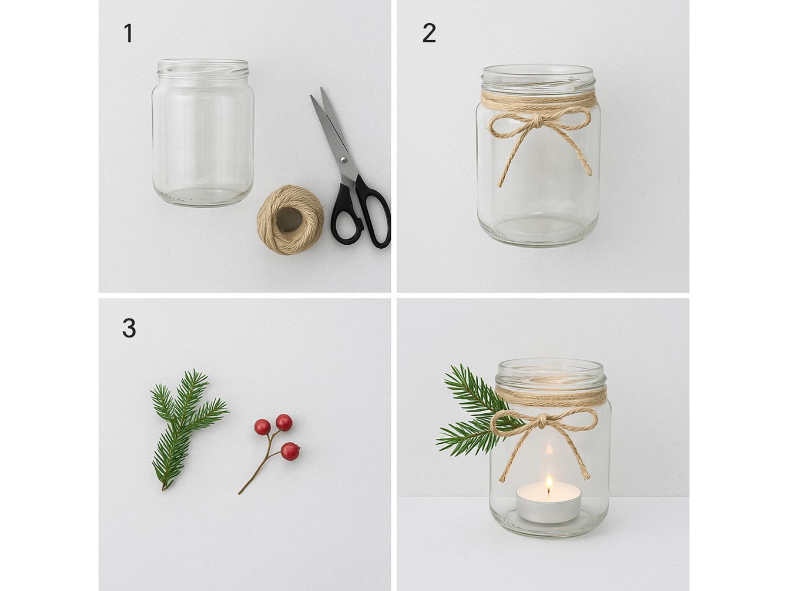 Reutiliza botes de mermelada e introduce dentro una vela y decora el exterior con vinilos decorativos o muérdago. Puedes utilizar nuestros vinilos decorativos para crear patrones como estrellas o copos de nieve.