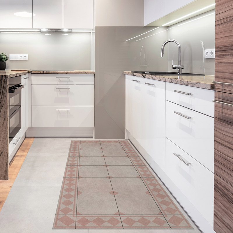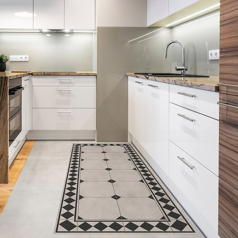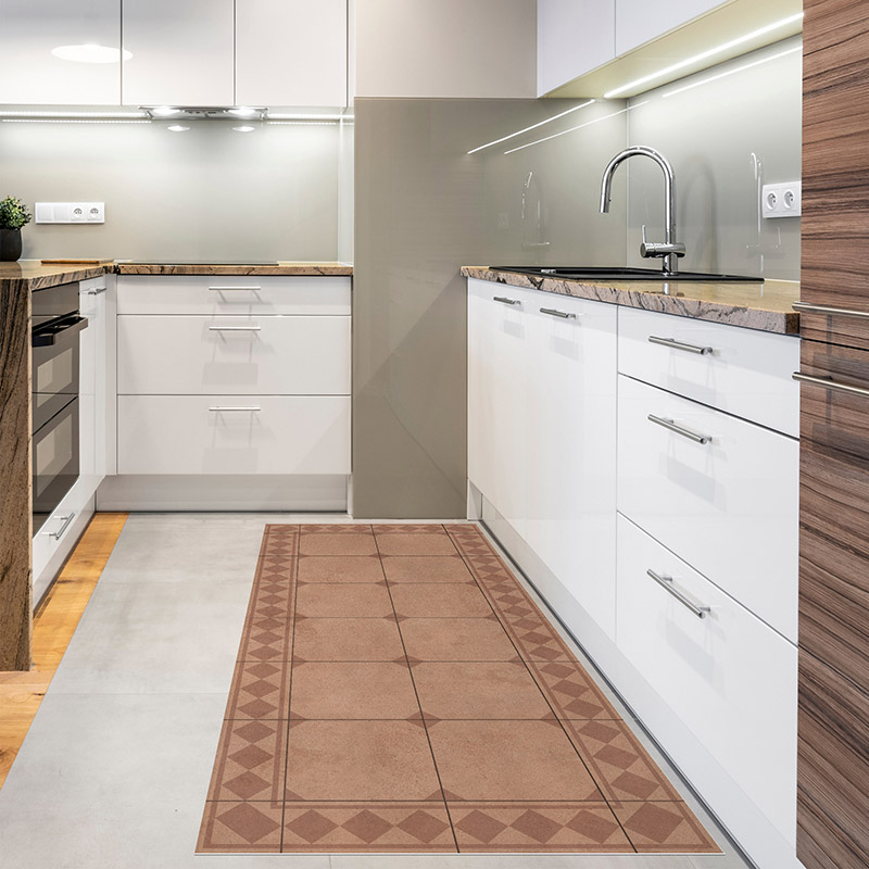 La alfombra vinílica Vintage Retro tiene un diseño geométrico en tonos neutros y negro. Aporta elegancia, orden visual y un toque clásico renovado a cualquier estancia. Ideal para cocinas, recibidores, comedores o pasillos con estilo. Una opción decorativa, práctica y fácil de combinar.