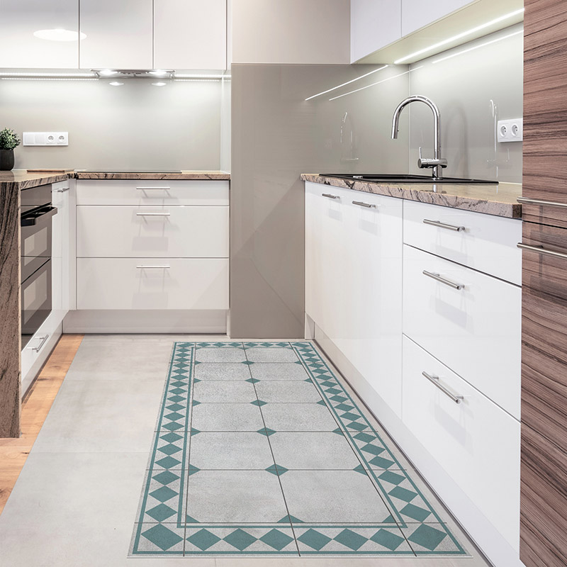 Estampado geométrico de inspiración hidráulica con cenefa de rombos en diferentes colores que enmarca el diseño y realza su estilo clásico y elegante. ¿Necesitas un tamaño personalizado de esta alfombra vinílica? Puedes realizar tu pedido aquí.